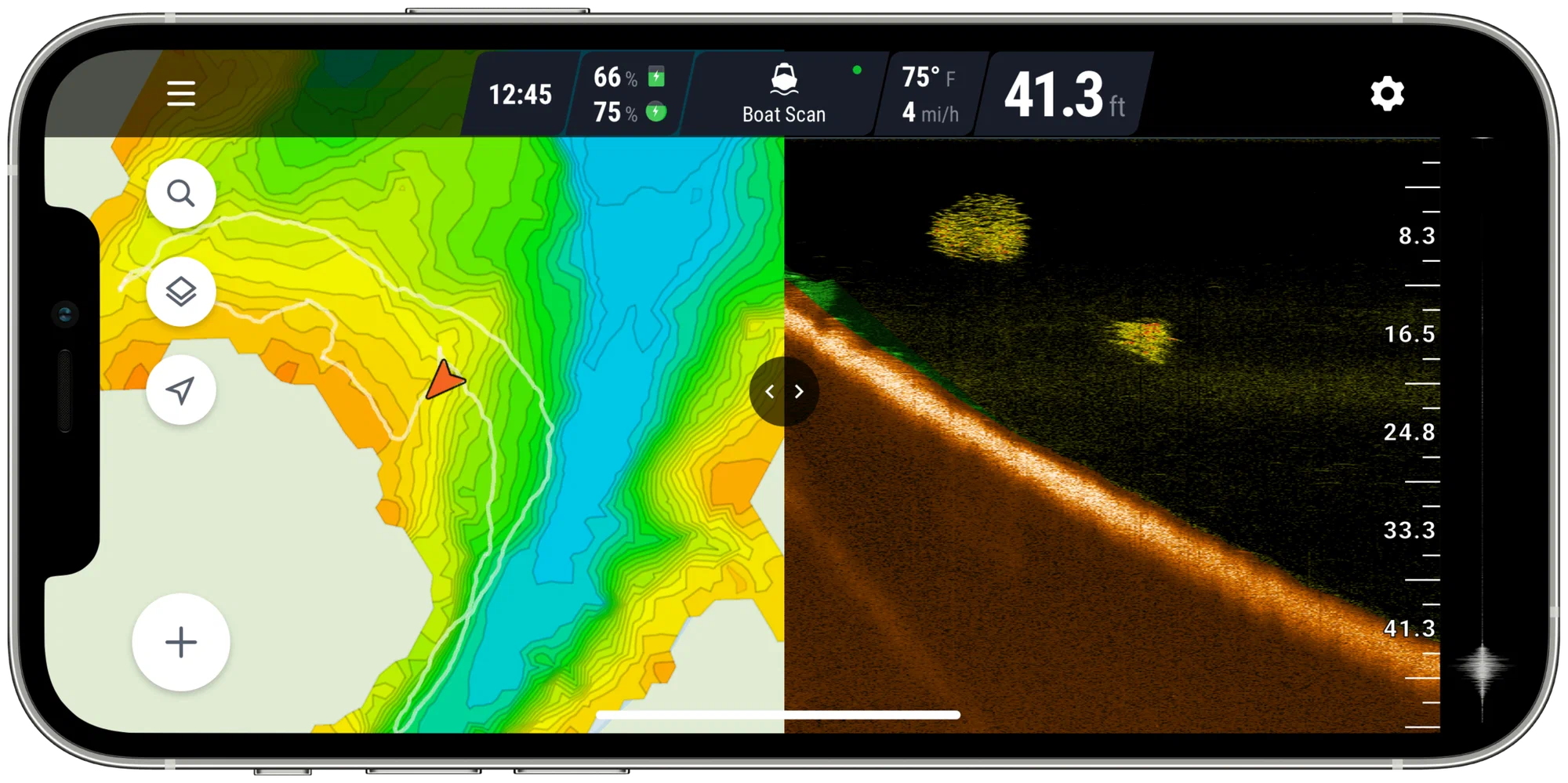 Эхолот DEEPER PRO+ 2.0 имеет 3 луча: широкий луч 47° (100 кГц), средний луч 20°(240 кГц) и узкий луч 7°(675 кГц), что позволяет ему эффективно производить общее сканирование водоема, подробно изучать найденные перспективные места и углубиться в мельчайшие детали выбранной точки. Помимо этого узкий луч 7° идеально подходит для зимней рыбалки даже с самого толстого льда, а разделение целей в 1 см поможет идентифицировать движение самых небольших приманок. Аккумулятор емкостью 950 мАч увеличил время работы до 9 часов. Кроме того, эхолоту DEEPER PRO+ 2.0 доступна быстрая зарядка - с 0 до 80% всего за 45 минут! Дополнительными нововведениями стали более четкие и наглядные данные сканирования и увеличение глубины сканирования до 100 м